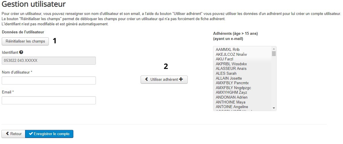 1 : Permet de débloquer les champs "Nom d'utilisateur" et "Email" si un adhérent avait été sélectionné