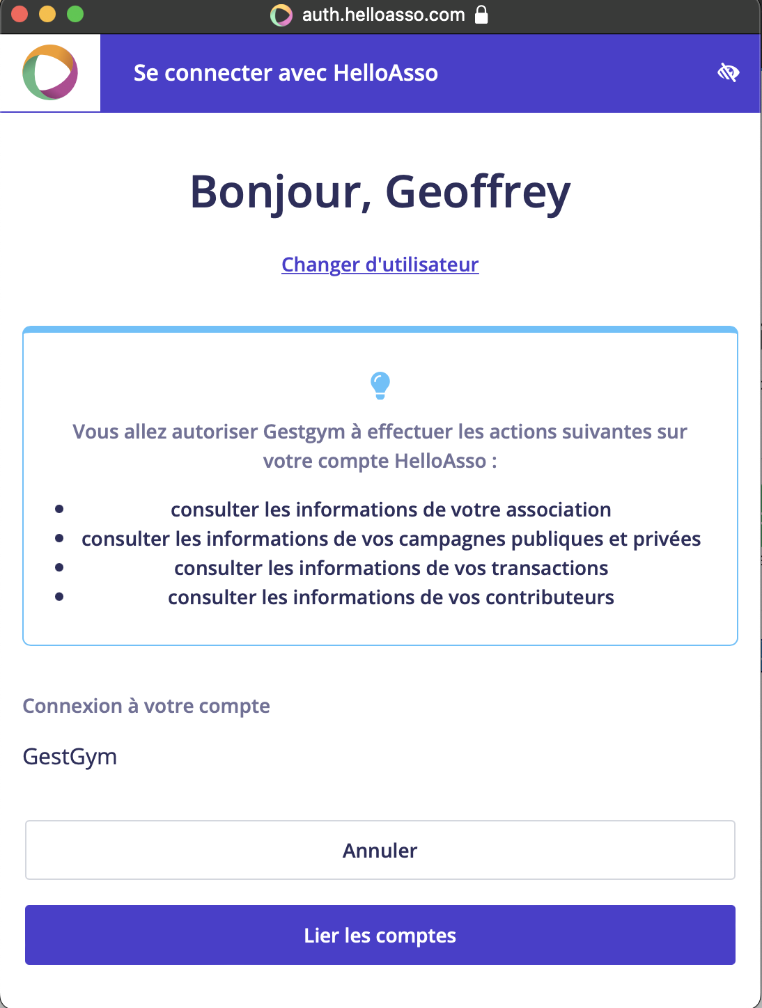 Suivre les instructions de la pop-up HelloAsso pour lier votre compte. (Il est nécessaire d'avoir au préalable créé un compte sur HelloAsso.com)