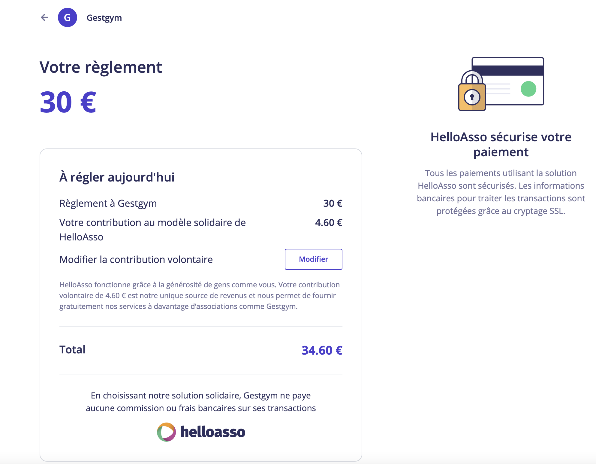 Il sera ensuite redirigé vers une page de paiement HelloAsso, une contribution volontaire (à destination d'HelloAsso) lui sera proposée, mais celle-ci est facultative.(N.B. : ce sont ces contributions qui permettent à HelloAsso de continuer de proposer gratuitement ce service aux associations).