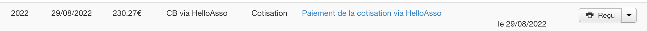 Lorsqu'un paiement s'est bien déroulé, il est automatiquement enregistré au niveau de la fiche adhérent avec le mode "CB via HelloAsso". Le statut de la cotisation est également mis à jour.