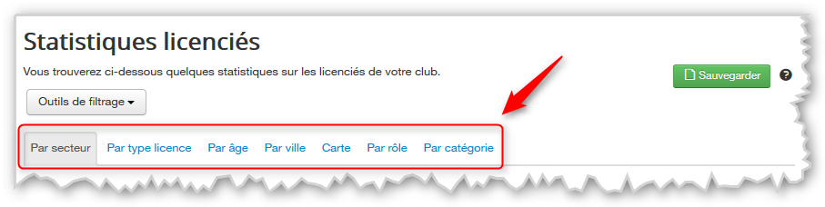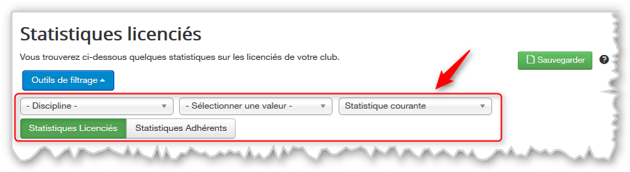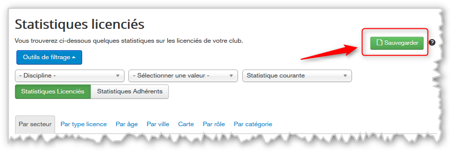 Quand une statistique est affichée il est possible de la sauvegarder à l’aide du bouton « sauvegarder » en haut à droite de l’écran.