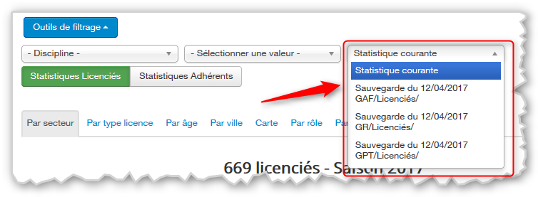Une fois une sauvegarde affichée, pour revenir aux statistiques courantes il faut sélectionner « Statistique Courante » dans la liste. La statistique courante se base sur la liste des adhérents/licenciés présents dans le système.